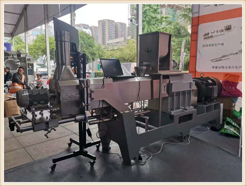 濟(jì)南晨陽公司攜帶新款CY65雙螺桿膨化主機(jī)亮相第19屆漯河食品博覽會,一經(jīng)亮相,變引起了眾多膨化食品生產(chǎn)企業(yè)的關(guān)注咨詢。詳細(xì)詢問該新款機(jī)型的性能特點(diǎn),和核心產(chǎn)品加工。該款65主機(jī)搭載45kw-6級電機(jī)直連傳動,齒輪箱使用原裝南京擠出機(jī)箱體,螺桿使用分段積木組合結(jié)構(gòu),機(jī)桶使用內(nèi)壁噴涂耐磨襯套材料。機(jī)桶恒溫控制,PLC自動控制,切割模頭升級。