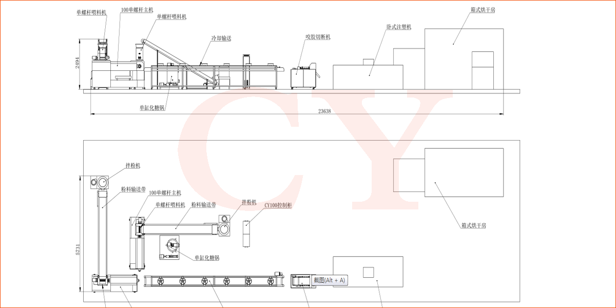 拌粉機(jī)→螺旋上料機(jī)→單螺擠出機(jī)→8米冷卻機(jī)→伺服切斷機(jī)