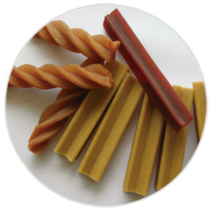 狗咬膠磨牙棒屬于一種寵物玩具或?qū)櫸锸澄?br /> .狗咬膠根據(jù)加工方法可以分為牛皮咬膠、壓鑄型咬膠、直接擠出型咬膠