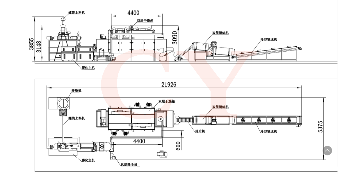 原料混合-(調(diào)制)膨化--烘干-噴油調(diào)味-冷卻-包裝
