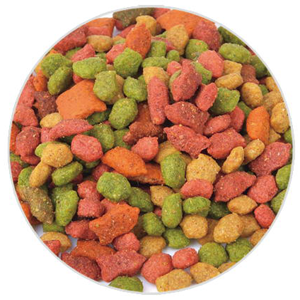 工藝方面寵物食品生產(chǎn)技術(shù)可將客戶的配方的體現(xiàn)在產(chǎn)品的形狀、大小、適口性、膨化度以及水分含量等,并可按照客戶要求著色、噴油、噴漿、噴粉以及成品自動混色(料)。