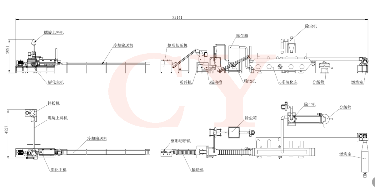 拌粉機(jī)→螺旋提料機(jī)→膨化主機(jī)→冷卻輸送-切斷機(jī)→提升機(jī)-粉碎機(jī)-除塵機(jī)-篩選機(jī)-提升機(jī)-震動(dòng)硫化床