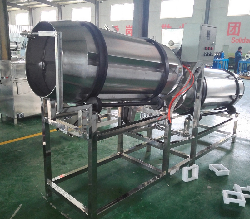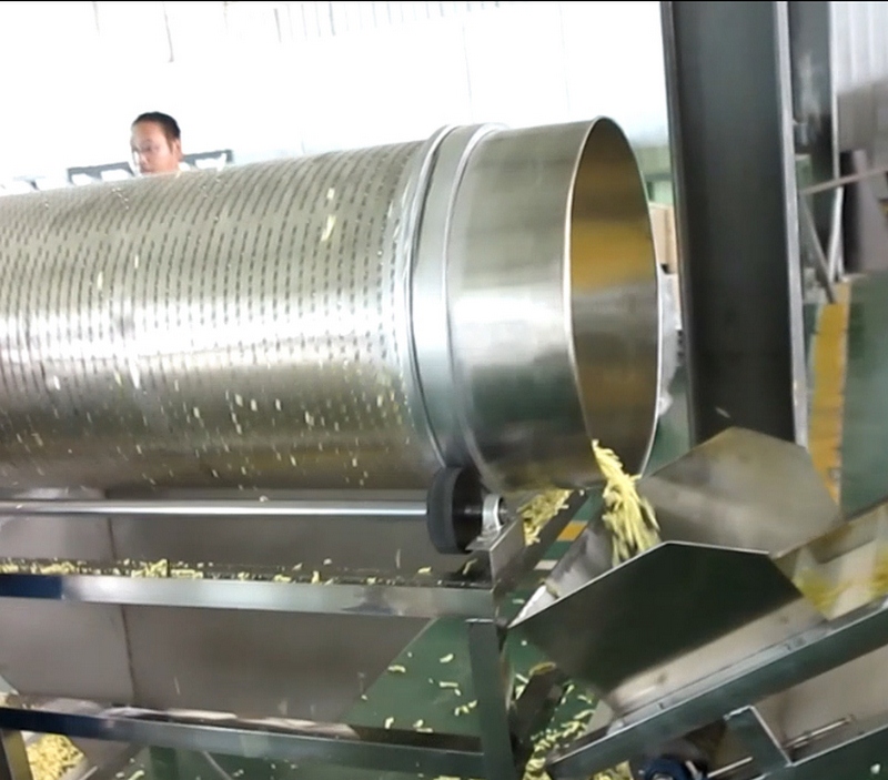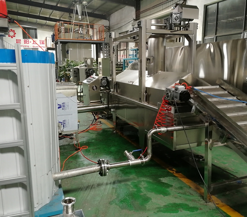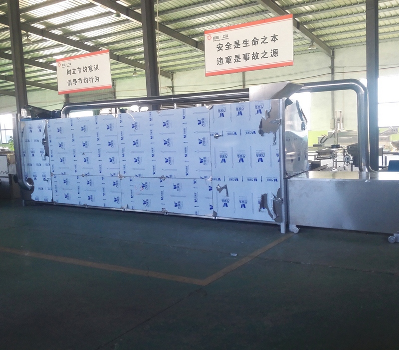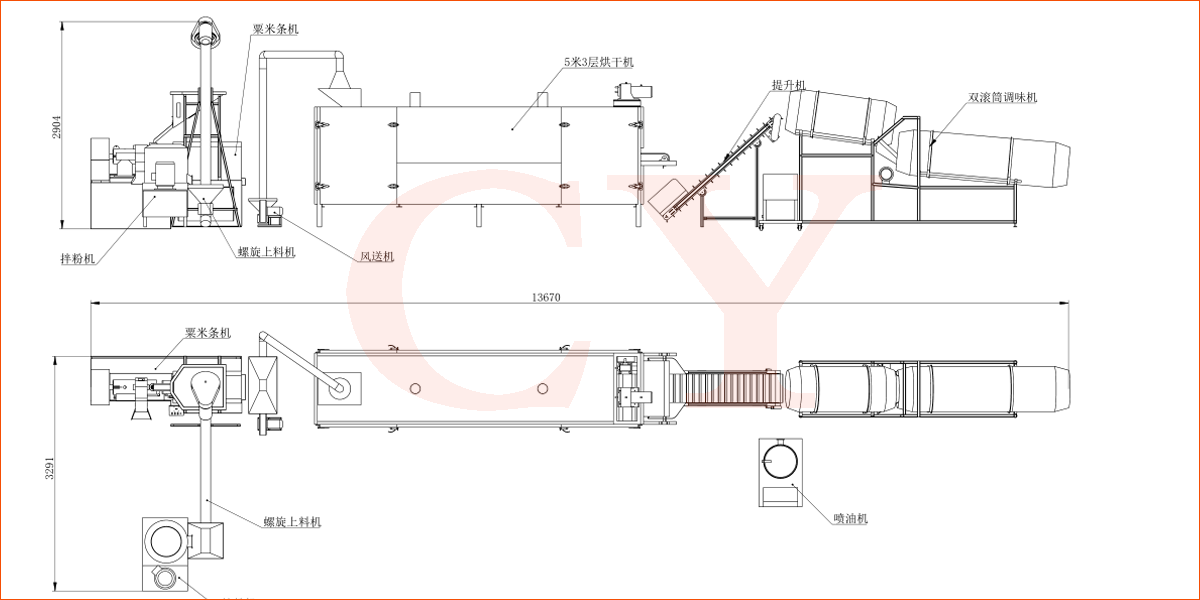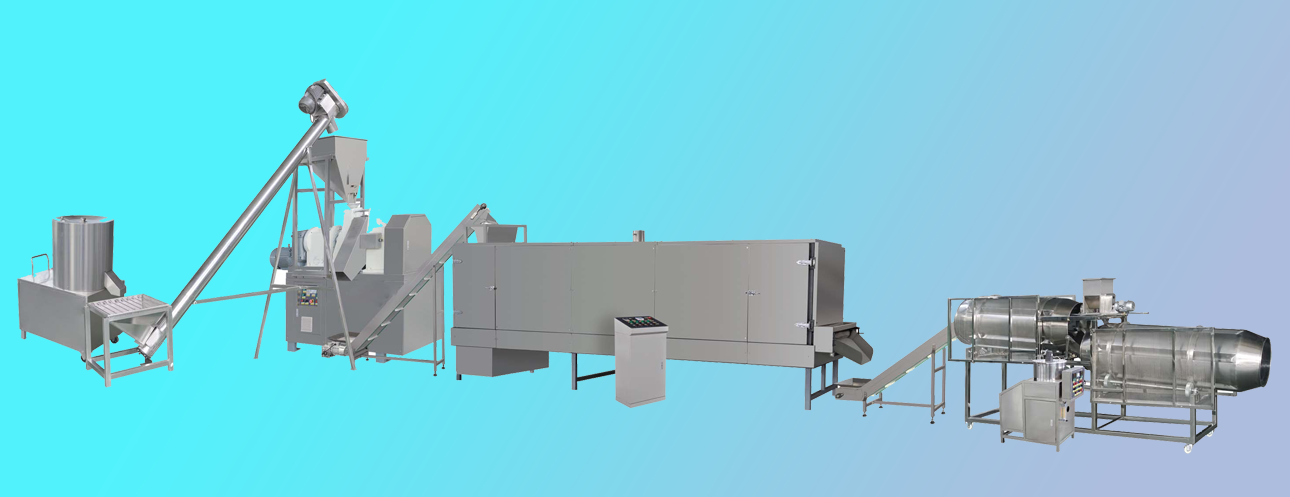 拌粉機(jī)→膨化機(jī)→提升機(jī)-一滾篩-提升機(jī)-連續(xù)油炸機(jī)-振動脫油機(jī)--單滾筒調(diào)味機(jī)-調(diào)味機(jī)