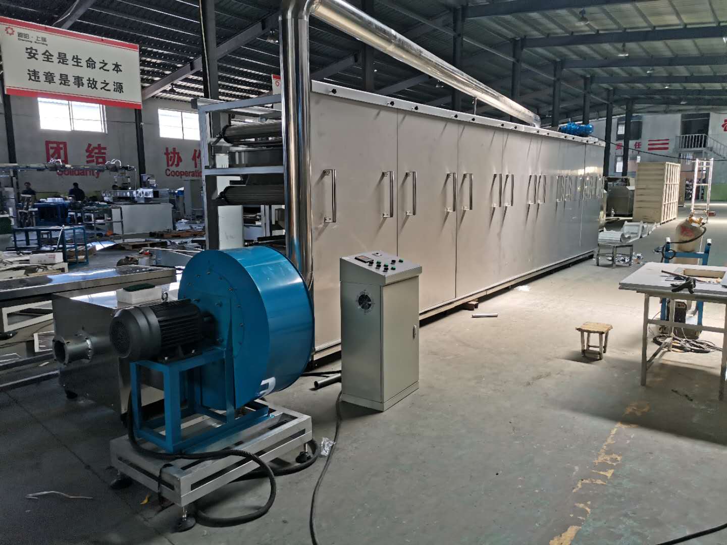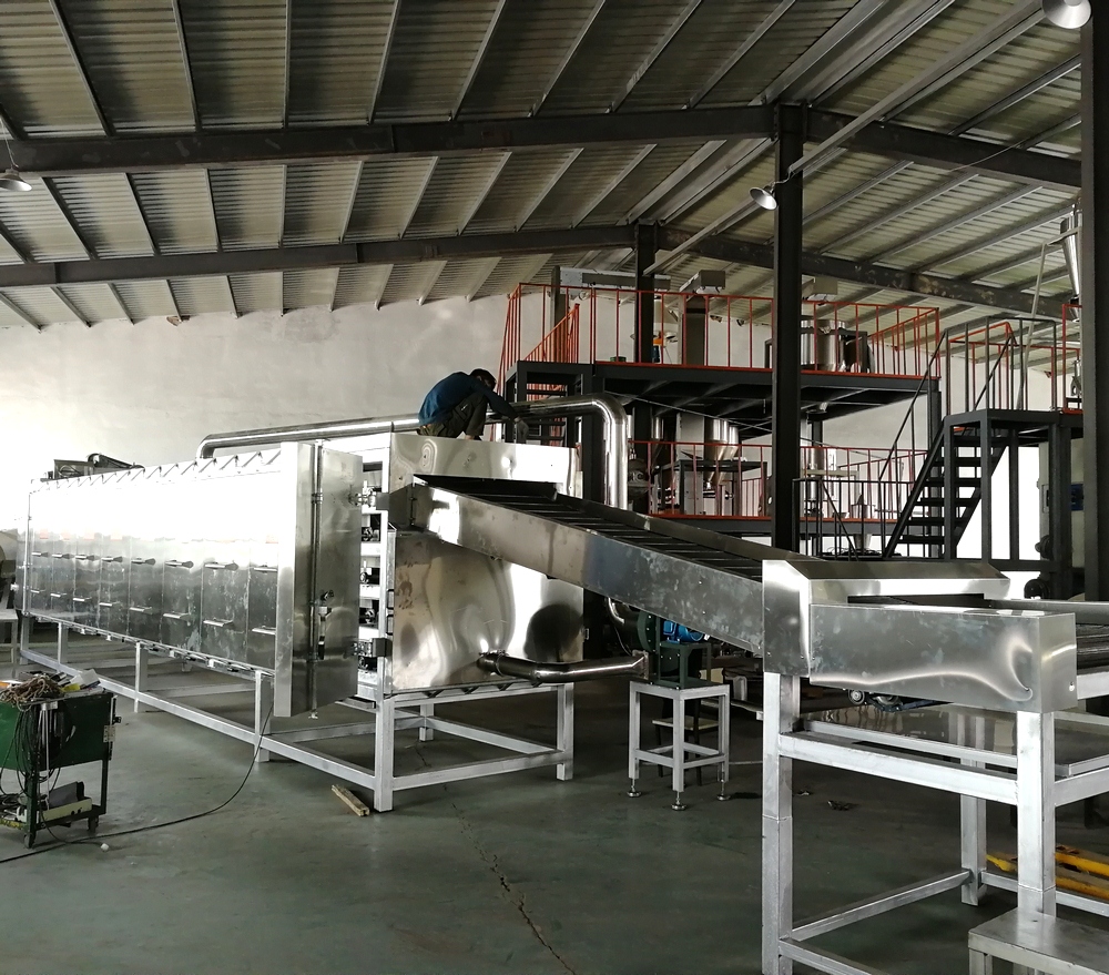 烤箱上料方式:可以直接選用帶爬坡結(jié)構(gòu)和外部借助輸送機(jī)送入烘干機(jī)料床,直接爬坡的烘干機(jī)結(jié)構(gòu)可以更直觀的觀測到物料布料狀況,多用于產(chǎn)量較大的生產(chǎn)線;借助外部上料的烤箱占地面積小,安裝方便,多用于單臺(tái)膨化主機(jī)的生產(chǎn)線配置