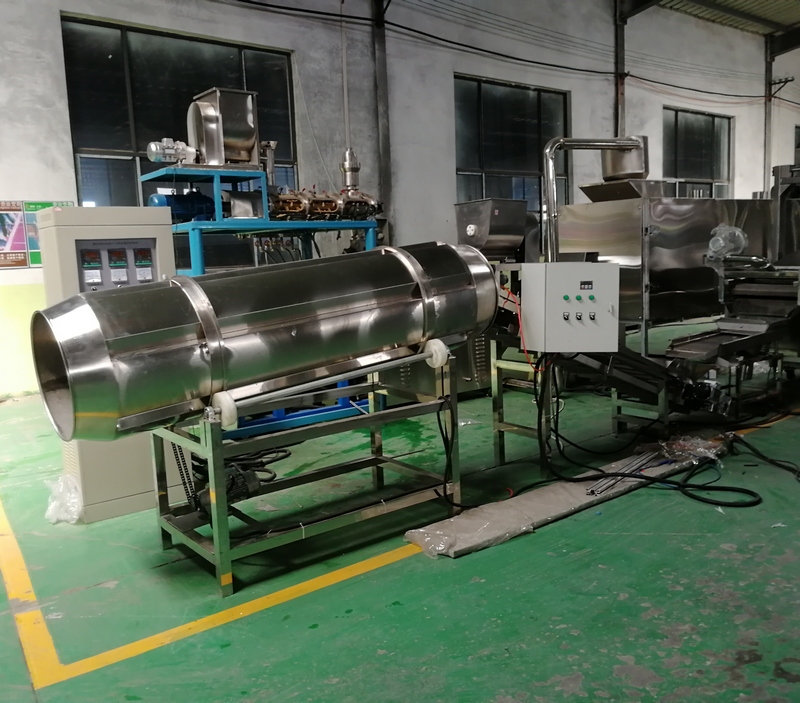 拌粉機(jī)→皮帶上料機(jī)→單螺桿擠出機(jī)→-提升機(jī)-八米五層干燥機(jī)-油炸機(jī)-震動(dòng)脫油機(jī)-單滾筒調(diào)味機(jī)
